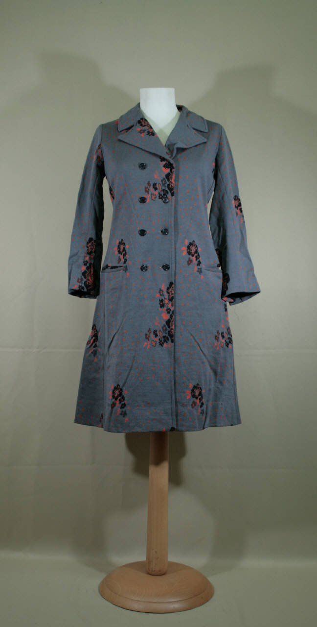 abito robe-manteau, lungo al ginocchio, in jersey operato a fondo grigio seminato a gocce color corallo, decoro a gruppi di fiori corallo e neri posti a scacchiera. Apertura anteriore totale, a doppiopetto, chiusa da 4 coppie di bottoni in plastica neri e occhielli corripsondenti. Ampio collo con risvolti; maniche lunghe con spacco chiuso da 2 bottoni con occhielli. Tasche orizzontali a filetto, sui fianchi.\nDavanti in due teli, dietro in due teli con fianchette che formano linea svasata. Fodera in taffetas nero. \nEtichetta in nastro operato.
