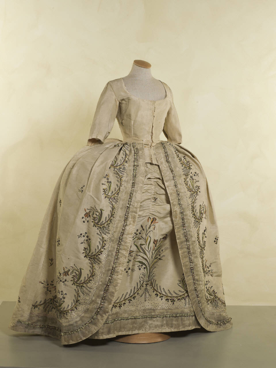 abito composto da veste e sottanino, in gros de Tours avorio, ricamato in seta e oro filato a punto erba, pieno e lanciato, con paillettes dorate e colorate; ricamo lungo l'apertura della gonna a festoni di foglie che sostengono mazzolini di fiorellini alternati a mazzolini con grande iris giallo. Lo stesso motivo, ingrandito, è disposto orizzontalmente nel sottanino. Sparsi (eccetto parti anteriori del corpino) piccoli tralci di fiori. L'abito ha subito modifiche che potrebbero aver alterato la foggia originale (corpino e maniche allargati con tessuto ricamato simile). Corpino con apertura chiusa da laccio passante in occhielli tondi nascosti, accostato da pinces; punta centrale che scende oltre la vita, sotto l'attacco della gonna. Parte posteriore con teli centrali lunghi dallo scollo all'orlo, che formano pieghe cucite fino alla vita. Ampia gonna che forma breve strascico, profilata all'apertura da larga gala arricciata in organza avorio fermata al centro da piccolo gallone. Sottanino fermato in vita da fettucce, accorciato da tre coulisse verticali (alterazione successiva).\nCorpino doppiato in tela di lino.