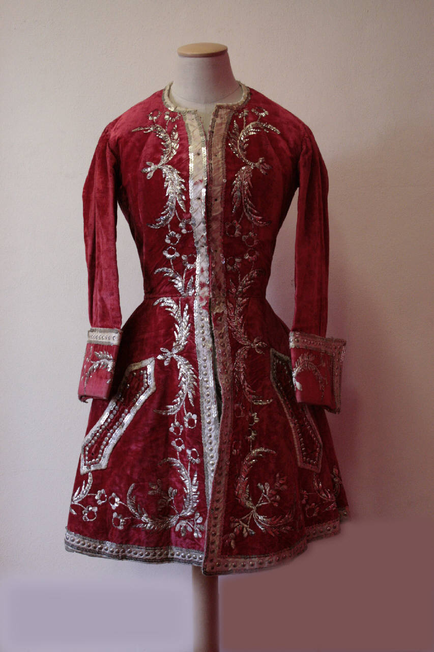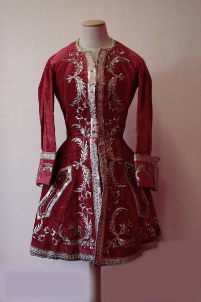 giacca lunga sotto i fianchi, ispirata alla marsina maschile. In velluto rosso, con profilature in raso avorio, ricamata con 2 tipi di argento lamellare che descrive successione di coppie di lunghe foglie terminanti con 2 fiori. le profilature in raso sono bordate da grandi paillettes argentate e decorate da fila centrale di paillettes bombate. Tagliata in vita, corpino aderente, girocollo, con apertura anteriore chiusa da 3 ganci al punto vita e dotata, dallo scollo ai ganci, di 4 coppie di occhielli tondi, per laccio passante o bottoni a gemello. falde a quarto di ruota. Tasche a filetto, oblique, nascoste da patta ricamata, con 4 occhielli per bottoni a gemello. All'interno della falda destra, al punto vita, è cucita una falda in gros marezzato avorio con ricamo simile alla giacca, che finge gilè sottostante (la falda sinistra è perduta).\nManiche in un pezzo, arricciate in alto, con alti paramani a punta, irrigiditi da cartone (?) interno. Dorso aderente; spacchi laterali entro piega, spacco centrale. Fodera in raso avorio.