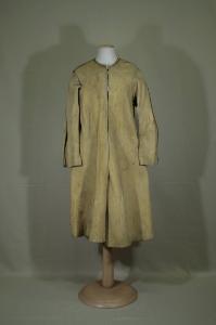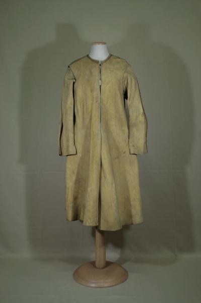 Completo formato da lunga giacca e bandoliera, in pelle scamosciata giallo senape. Giacca lunga al ginocchio; quarti anteriori e posteriori tagliati ciascuno in un unico pezzo. Girocollo, apertura con mostre diritte, chiusa da ganci dallo scollo alla vita. falde svasate, con spacchi sovrapposti in corrispondenza delle cuciture dei fianchi e centro dietro. Nelle falde, negli angoli all'orlo anteriori e posteriori, sono cuciti internamente ganci per rigirare e unire le falde lungo i fianchi. Maniche sagomate, con spacco al fondo. Le cuciture sono eseguite con margini all'esterno, a doppia filza con spezzoncini di canutiglia che coprono i punti. All'interno dell'apertura e degli spacchi è cucito un cordoncino di rinforzo. Mostre in tela nocciola.\nBandoliera in pelle scamosciata giallo senape, con decori a traforo e applicazione a cucito di striscioline smerlate e arricciate. Le estremità ad aletta sono diverse: una trapezoidale, l'altra cuoriforme. All'interno di entrambe una seconda aletta trapezoidale.