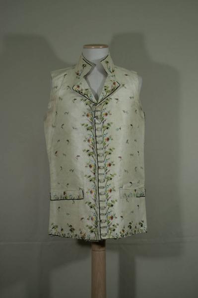 Gilè lungo fino ai fianchi in taffetas, ricamato a disposizione con seta policroma a punto piatto, erba, nodi e motivo a boccioli di rosa, tulipano e myosotis alternati a foglie. Il taglio non ha sempre rispettato la disposizione del ricamo, sul fianco destro è presente il ricamo per i bottoni. Collo a cinturino con risvolti, mostre diritte chiuse da 10 bottoni rivestiti e ricamati e occhielli corrispondenti ricamati a disposizione dallo scollo al fondo; diritto al fondo, con tasche orizzontali con patte cucite. Dorso in tela naturale.\nFodera nella stessa tela.