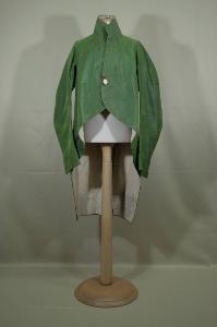 Marsina in velluto riccio operato con motivo a scacchiera di minuti rombi verdi su fondo celeste pervinca.\nAlto collo a cinturino (h 9,5cm), mostre molto stondate sfuggenti verso il fianco al punto vita. Tracce dell'applicazione di 8 bottoni (tutti perduti); 3 occhielli funzionali all'altezza del petto.\nFalde molto sfuggenti. Patte decorative sagomate sui fianchi e tracce dell'applicazione di 3 bottoni decorativi sotto la patta.\nManiche molto lunghe, arricciate in alto, aderenti, sagomate con paramani aderente alla manica; tracce dell'applicazione di 3 bottoni decorativi (perduti).\nDorso ampio; spacchi laterali cuciti entro piega, tracce di applicazione di bottoni in alto e all'orlo; spacco centrale /sovrapposto. Tasche a sacchetto inserite negli spacchi laterali.\nFodera in diagonale avorio. Rinforzi nel collo e nelle mostre.\nTimbro all'interno di una manica.