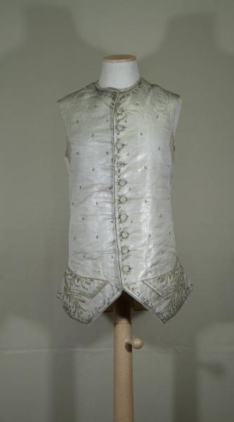 Gilè lungo fino ai fianchi in gros de Tours avorio laminato argento, ricamato con oro, canutiglia dorata, strass, paillette bombate dorate e paillettes dorate e colorate rosso e verde, con motivo di lunghe foglie e infiorescenze nelle patte e sotto le tasche, cornice perlinata lungo i bordi. Girocollo, mostre diritte chiuse da 11 bottoni rivestiti ricamati e11 occhielli corrispondenti dallo scollo al fondo; falde divergenti a punta, con tasche e patte sagomate. Dorso in tela naturale.\nFodera dei quarti anteriori in tela di cotone o lino ; nelle mostre e falde in gros avorio.