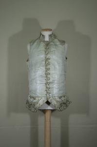 Gilè lungo sotto la vita in gros grigio perla laminato in argento filato, ricamato con oro filato, paillettes dorate e strass con motivo di mazzi di spighe sotto le tasche e serie di piccole infiorescenze lungo l'apertura e lo scollo; paillettes sparse sui quarti anteriori. Alto collo a cinturino, mostre diritte chiuse da 9 bottoni rivestiti ricamati e occhielli corrispondenti dallo scollo al fondo; falde divergenti a punta, con tasche e patte sagomate. Dorso e fodera in panno avorio, nelle falde, mostre e collo in diagonale di seta avorio. Dorso regolabile con 2 coppie di lacci.\nFodera¿