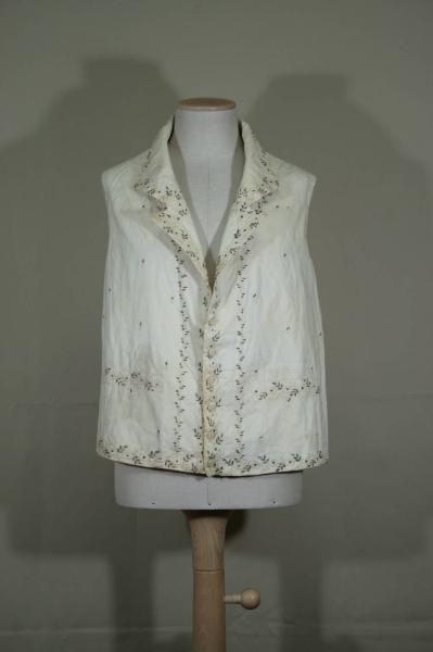 Gilè corto in vita in tela bianca, ricamatocon argento filato e cotone bianco a punto piatto e nodi e motivo di anelli perlinati con foglie bianche e argento; il ricamo è posto anche all'interno delle mostre. Svollo a V con risvolti, mostre diritte chiuse da 6 bottoni ricoperti ad ago e occhielli corrispondenti dallo scollo al fondo. Diritto al fondo, con finte patte cucite. Dorso in tela di lino bianca,quarti anteriori doppiati con la stessa tela. Allargato al centro dietro con inserimento di gherone.