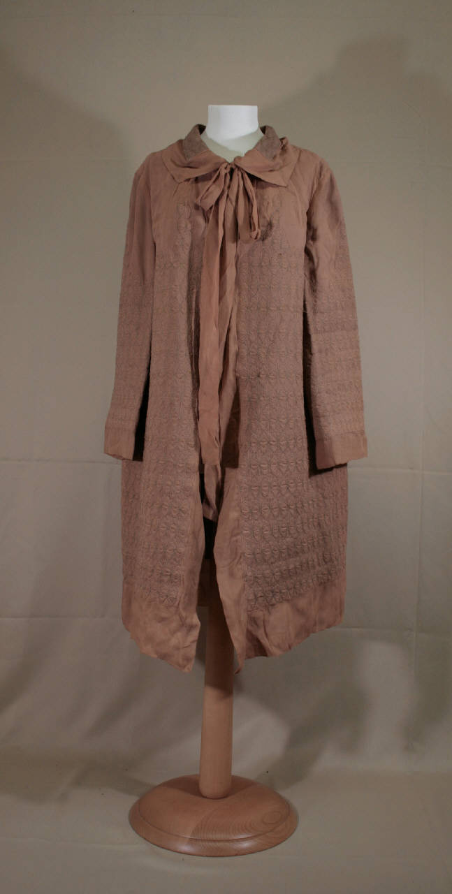 vestaglia corta al ginocchio, in crespo rosa antico, trapuntata a macchina con filo marrone e avana che forma motivo a ovali concentrici; la trapuntatura non comprende la zona delle spalle, la parte alta e il fondo delle maniche, e una fascia presso l'orlo. Doppiata in diagonale rosa antico, eccetto lungo i bordi e il fondo maniche. Linea diritta a sacco, girocollo con collo piatto. Sotto il collo sono fissati due lunghi cinturini nello stesso tessuto, da annodare per chiudere la vestaglia. Maniche ampie e lunghe.\nEtichetta all'interno, sul dietro sotto lo scollo, in nastro operato riportante "été 1926 - Jeanne Lanvin - Paris - Fbg. St. Honoré"