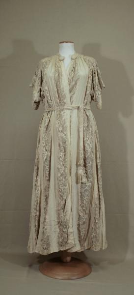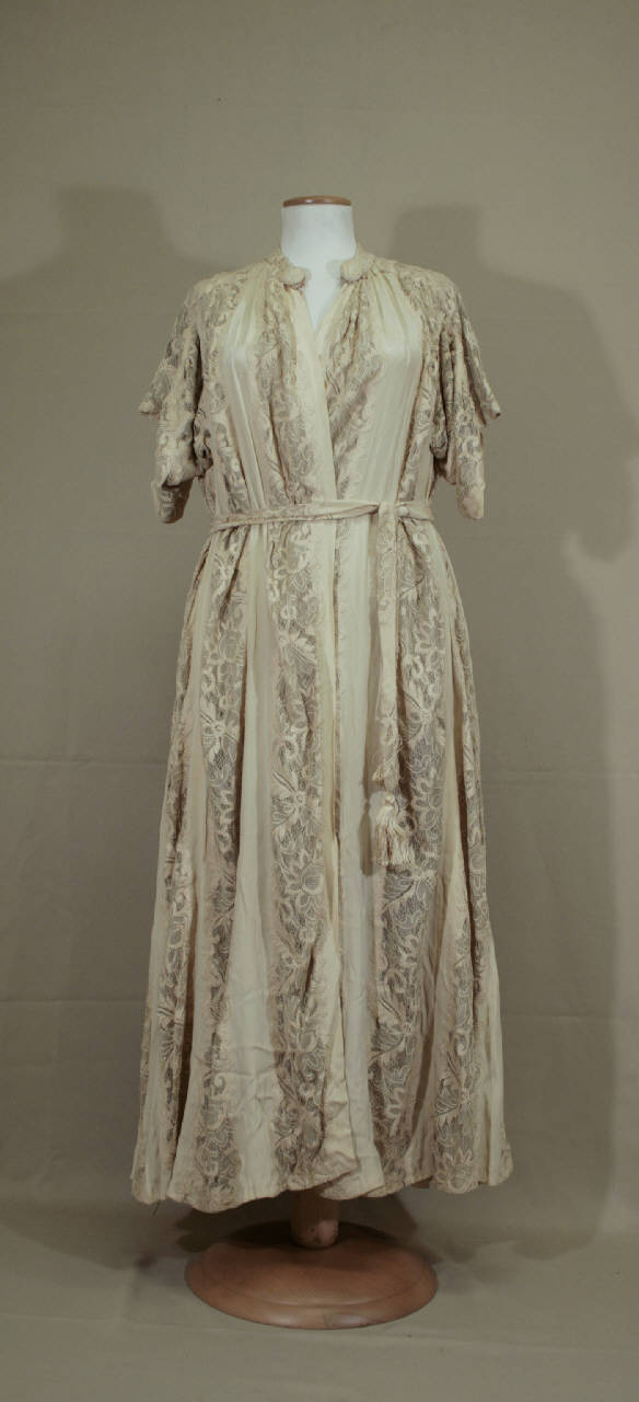 Vestaglia lunga in bande di crespo avorio alternate a inserti di merletto avorio, disposti in verticale sul davanti e a spina sul dietro. Di linea diritta sul davanti e molto svasata sul dietro. Girocollo con piccolo collo a cinturino; alla base del collo chiusura con gancio e 2 bottoni decorativi rivestiti in merletto. Maniche corte rettangolari. Cintura a fusciacca nello stesso tessuto e merletto, terminante con 2 grandi nappe a cavaliere in filo di cotone. Doppiata in leggerissimo crespo avorio che forma ruche increspata lungo l'apertura e orlo. Fodera del dietro in diagonale avorio.