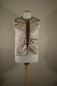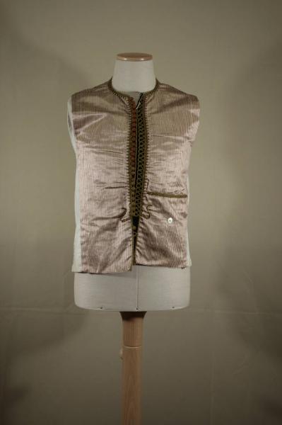 Gilè lungo oltre la vita, diritto al fondo, con quarti anteriori in pekin rigato rosa (raso) e viola (chevron). Girocollo, con mostre diritte chiuse da ganci, profilate da passamaneria in cotone verde oliva: a destra piccoli bottoni sferici ricoperti ad ago, verde oliva e marrone, a sinistra la passamaneria forma asole su profilatura in panno blu. A sinistra tasca orizzontale decorativa profilata da cordoncino verde oliva; sotto la finta tasca un bottone in madreperla bianco. Fianchi e dorso (più corto) in tela bianca regolabile da coppia di lacci; la stessa tela fodera i quarti in pekin.