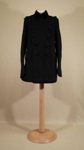 Giacca di livrea da autista in panno nero, lunga sotto i fianchi. Piccolo collo in velluto blu con fascetta; doppiopetto, chiusa dalle spalle alla vita da 6 coppie di grandi bottoni ricoperti. Patte decorative. Maniche larghe, lunghe, con spacco al fondo chiuso da 2 bottoni. Dorso aderente in un pezzo. Mostre e parte inferiore foderate in panno rosso; tasca applicata all'interno della mostra sinistra. Fodera del dorso in rasatello nero con imbottitura; fodera delle maniche in raso stampato rigato bianco e nero.