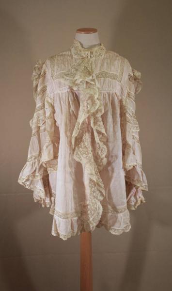 Matineé in batista rosa chiaro, con inserti e ruches in merletto avorio.Sprone diritto con nervature verticali e inserti in merletto, collo a ruche; maniche ampie ad aletta. Parte inferiore arricciata sotto lo sprone, apertura o orlo profilati da balza arricciata che forma jabot sotto lo scollo.