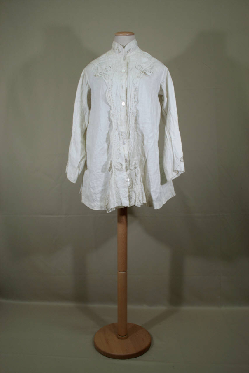 matinée in tela bianca ricamata in bianco a intaglio, punto erba, pieno, nodi, e riempimenti ad ago. Linea svasata, girocollo con collo a cinturino; apertura centrale con bottoni affiancata da larghe mostre sovrammesse, cucite allo scollo e all'orlo. Maniche lunghe, svasate al fondo.