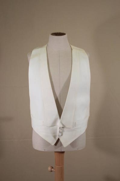 Gilè costituito solo dai quarti anteriori, fissato dietro il collo da cinturino e da cinturino regolabile con fibbia al punto vita sul dorso. In piquet a nido d'ape bianco, scollo profondo a V con risvolti sciallati a punta; chiuso da 3 bottoni a gemello rivestiti. Falde a V; due piccole tasche con patta cucita. Fodera in tela bianca.