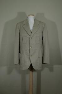 Completo composto da giacca modello norfolk, gilè e calzoni alla zuava in diagonale nocciola screziato. Giacca a 3 bottoni, collo a risvolti, 2 taschini e 2 tasche a soffietto applicati. Dietro taglio in vita, 2 soffietti laterali e scacco centrale sovrapposto. Maniche con spacco al fondo chiuso da 3 bottoni e occhielli decorativi. Fodera in taffetas marrone rosato; nelle maniche rigato bianco marrone. Gilè monopetto lungo alla vita; scollo a V, chiuso da 5 bottoni; 2 taschini e 2 tasche a filetto con piccola patta. Dorso in taffetas marrone rosato con coppia di cinturini con fibbia. Fodera in diavgonale spinata bianca. Calzoni alti in vita, con pinces. Cintura hiusa da ganci, con passanti e, all'interno, bottoni per bretelle. Patta verticale a 5 bottoni nascosti. Taschino a sinistra sotto la cintura, tasche inserite nelle cuciture laterali, tasca a soffietto con bottone sul dietro. Gambe ampie, arricciate al fondo e strette sotto ilginocchio da fasce nello stesso tessuto chiuse da 6 bottoni. Fodera di cinture e tasche in diagonale verde chiaro. Sostegno delle fasce in tela naturale.\nEtichette: taschino interno della giacca. Interno dorso del gilè. Interno dietro dei calzoni (vd foto).