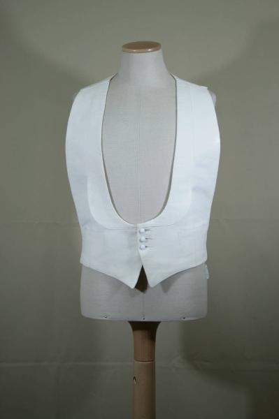Gilè costituito solo dai quarti anteriori, fissato dietro il collo da cinturino e da copia di cinturini regolabili con fibbia (marchio SOLIDA) al punto vita sul dorso. In piquet a con motivo a barrette diagonali bianco, scollo profondo a V con risvolti sciallati; chiuso da 3 bottoni a semisferici in plastica bianca. Falde appena divergenti a V; due piccole tasche con patta cucita. Fodera in tela bianca.