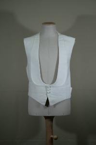 Gilè doppiopetto, corto alla vita, in piquet bianco, scollo profondo ovale con risvolti sciallati; chiuso da 3 bottoni a gemello in plasticabianca. Falde appena divergenti a V; due piccole tasche con patta cucita. Dorso e fodera in tela bianca. Sul dorso cinturini con fibbia (marchio SOLIDE); su uno dei cinturini sono ricamate le iniziali QM.