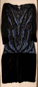 Abito a vita bassa, lungo alle caviglie. Corpino in tulle nero decorato da motivi a V formati da bande in paillettes couvettes nere grandi fissate di taglio da perline di vetro grigie; rigature rese da paillettes couvettes nere piccole, frange di perline azzurre fissate alle due estremità; le paillettes sono fissate a punto Lunéville. Gonna in velluto nero. Corpino con ampio scollo ovale profilato da perle di jais nero sfaccettate; di linea diritta, con apertura posteriore centrale chiusa da automatici. Ma niche lunghe in tulle, blusanti, con alti polsi in velluto chiusi da 2 bottoncini rivestiti. Maniche e sprone doppiati in crespo nero. Gonna appena arricciata. Fodera in taffetas nero con apertura posteriore chiusa da automatici. Bustino interno, forse di reimpiego, in taffetas avorioprofilato da merletto, chiuso al centro dietro da ganci. Resti di nastro stringivita di raso; etichetta in nestro operato riportante " Fiorio". Nel giromanica sinistro è presente un ago infilato con filo nero, dimenticato all'interno.