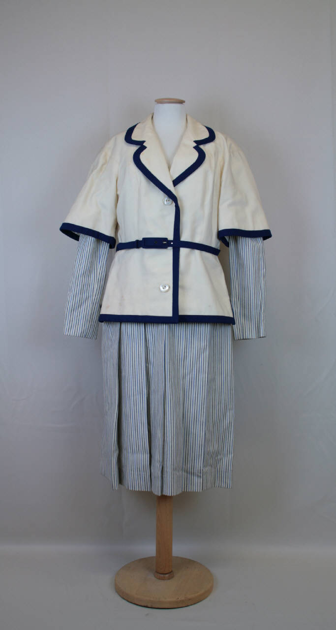 Completo composto da abito e giacca. Abito lungo al polpaccio in diagonale avorio, a sottili righe azzurro e blu. Corpino davanti in 2 pezzi, con pinces al seno, scollo a V. Dietro in due pezzi con apertura centrale con cerniera. Maniche lunghe, diritte. Gonna con baschina, in diagonale avorio profilata da strisce in tela blu, che sostiene la parte inferiore con 4 pieghe davanti e dietro.\nGiacca avorio lunga ai fianchi, profilata con spighetta blu. Scollo a V con ampio collo a risvolti stondati; chiusa da 3 bottoni in madreperla e occhielli a filetto corrispondenti. Davanti in 4 pezzi con fianchette corte inserite sopra la vita; dietro con baschina. Sui fianchi spacchi sagomati. Spalle calate, maniche corte al gomito, svasate, senza pala. Cintura in tela blu doppiata in pelle, con fibbia rivestita.\nFodera della giacca in taffetas bianco; nell'abito è presente solo nella baschina. \nEtichetta in nastro stampato all'interno della giacca, nel fianco destro.