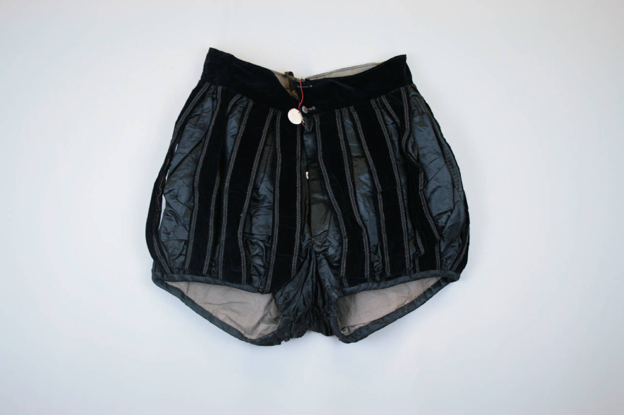 Calzoni corti a gigot in raso nero, con sovrapposte bande verticali staccate in velluto nero profilate da passamaneria. Alta cintura in velluto chiusa davanti da due bottoni metallici con diverso marchio impresso, e dietro da fettuccia passante in occhielli tondi. Patta verticale con 3 bottoni nascosti. Arricciati in vita e al fondo delle gambe. Fodera in diagonale nocciola.