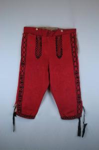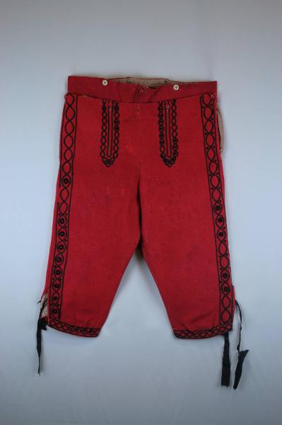 Calzoni confezionati in panno rosso, ricamati sui fianchi, sulla patta e sui cinturini con applicazione di treccia piatta nera che forma intreccio a 8; negli occhielli così resi, dischetti in panno nero.\nAlta cintura chiusa davanti con 2 bottoni. Bottoni per bretelle davanti e dietro.\nLarga patta alla marinara fermata a 5 bottoni. Due tasche sagomate inserite nella fodera sui fianchi. Gambe aderenti, con spacco al fondo chiuso da 2 laccetti e da cinturino. \nFodera in tela naturale.