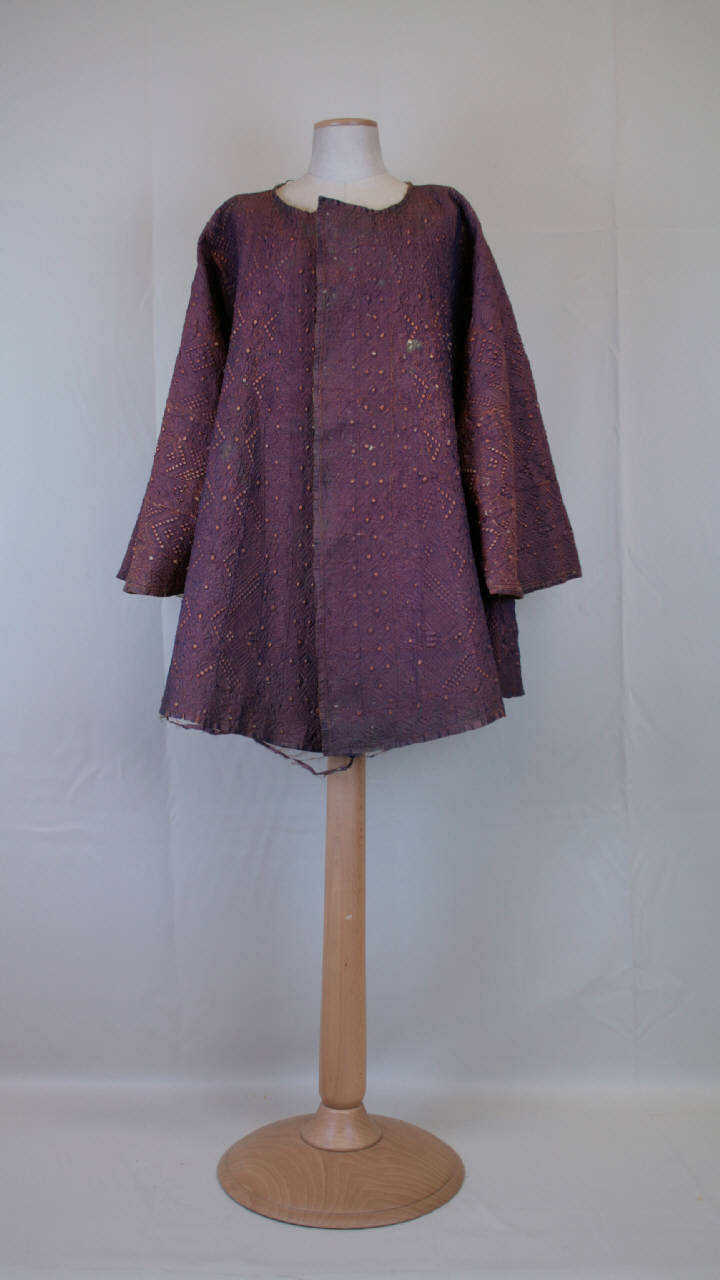 Vestaglia corta sotto i fianchi, in taffetas viola cangiante (ordito blu, trama arancio) ricamata a trapunto con filo di seta viola, controfodera in tela naturale e imbottitura in fili di lino (o cotone). Il decoro è distribuito su tutta la superficie disposto secondo il modello della veste, a bande verticali simmetriche rispetto al centro, con motivi floreali o geometrici sempre diversi. Lungo i bordi e l'apertura cornici a motivi floreali. Davanti, dietro e maniche tagliati in un unico pezzo, con l'aggiunta di due bande al centro davanti e piccoli gheroni sui fianchi, le cuciture precedono il ricamo; la cucitura continua che chiude la parte inferiore delle maniche e i fianchi è posteriore al ricamo. Girocollo, maniche lunghe molto ampie; linea svasata, sagomata sui fianchi dai gheroni. Apertura anteriore con sovrammettitura, senza sistema di chiusura.