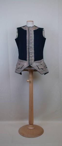Gilè monopetto di livrea, lungo sotto la vita, in panno blu decorato da alti galloni argentati a righine rosa e verdi. Girocollo, chiuso davanti da 11 bottoni rivestiti ad ago e occhielli corrispondenti. Falde sfuggenti, due tasche con patta sagomata cucita; spacchi sui fianchi. Dorso con spacco centrale, allargato con inserto in panno blu. Fodera in tela bianca, nelle mostre in tela cerata blu. Nella fodera del dorso scritta a mano non leggibile. Cartellino cucito all'interno con scritto " Rinvenuto in un cassettone nella Sala dei Bronzi".