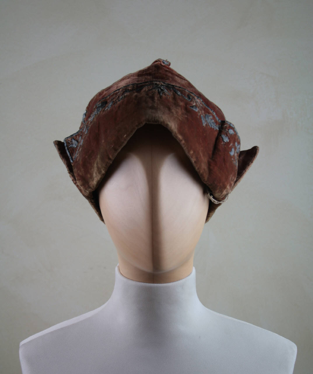 Berretto da casa in velluto tagliato arancio-mattone; ricamo in argento filato a punto posato con imbottiture, disposto nel profilo della tesa, lungo le cuciture e sulla cima. Motivo a sottili foglie a voluta, con fiori tipo tulipano e, sulla cima, 4 infiorescenze a campanula pendenti.\nCupola in due pezzi, sagomata alla cima da 2 pinces perpendicolari alle cuciture che formano con queste 4 punte. Tesa rialzata verso l'alto, cucita alla cupola al giro d'entrata, e sagomata per formare due punte laterali. Doppiata in tela rossastra. La parte della cupola coperta dalla tesa è in tela rossastra.\nSupporto in tela naturale nei ricami della cima.