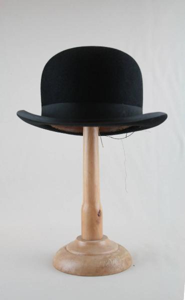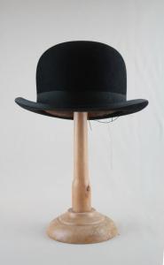 Bombetta in feltro nero, con tesa profilata da nastro gros nero. Cinta in nastro gros nero che forma fiocco sul dietro. Fodera in taffetas bianco; giro d'entrata in marocchino color cuoio ristretto da coulisse sul dietro. Timbro in nero nella cima della fodera.