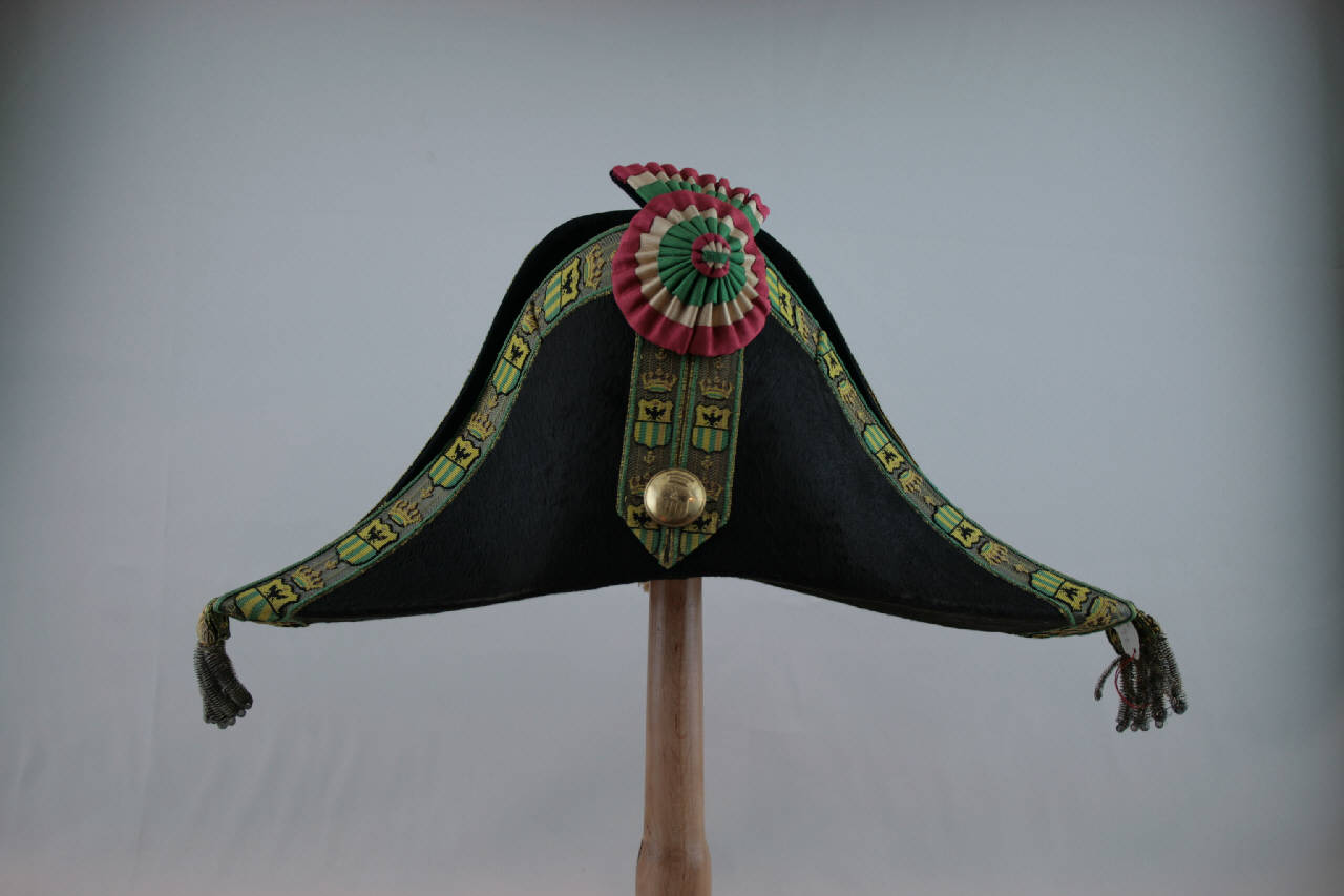 Due feluche uguali (a lanterna o lucerna) in feltro nero a pelo lungo. Calotta tronco-conica e tesa a due punte, con ala sagomata e ripiegata in alto davanti e dietro. Tesa profilata da gallone in velluto riccio, con fondo dorato e stemma della famiglia Corti in giallo, verde, nero; agli estremi laterali della tesa il gallone sostiene frangia in canutiglia dorata. Sul davanti ganza formata dallo stesso gallone e fermata da bottone dorato con stemma Corti. Coccarda tricolore bianco, rosso, verde, in nastro gros. Fodera in taffetas bianco, con cima imbottita e trapuntata sulla quale è stampato il marchio del produttore. Marocchino in pelle bianca con coulisse.\nNel cappello b, all'interno, è scritto a mano "AC".