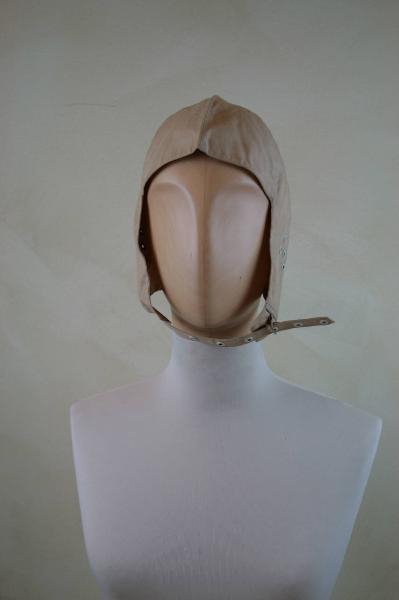 Cuffia in leggera tela nocciola, in doppio strato. Confezionata a 6 spicchi, dei quali i due laterali si prolungano a formare paraorecchie con fori auricolari con occhielli tondi in metallo. A destra è fissato il sottogola a cinturino nella stessa tela da allacciare alla fibbia posta a sinistra. Coulisse con elastico sulla nuca. Alla cima passante cucito. All'interno timbro in nero del produttore.