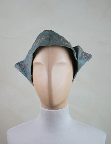 Berretto da casa in taffetas celeste, con lunga calotta conica a 4 spicchi uniti con cucitura ribattuta, con alta tesa rialzata; ricamo lungo il bordo della tesa in seta a punto pieno, erba, nodi che descrive sottilissimo tralcio bianco con foglie e fiorellini rosa e gialli. Sulla cima rosetta in merletto argento.