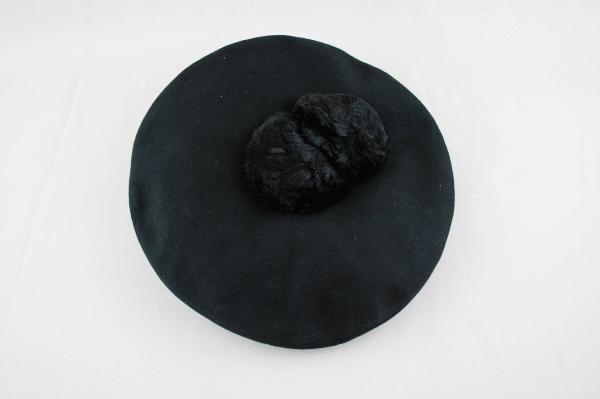 Basco in feltro nero in due pezzi con cucitura lungo il profilo esterno, con cinturino. Al centro del piatto superiore due grandi pompon in seta nera. Cinturino doppio con giro d'entrata in gros nero. All'interno etichetta in nastro stampato; sul retro dell'etichetta è cucito un nastrino con scritto "73..073".