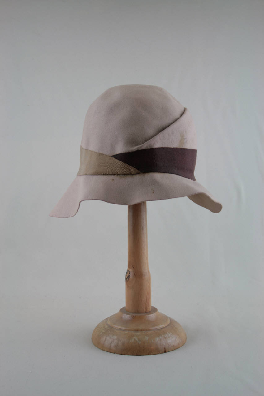 Cloche in feltro nocciola rosato. Calotta a cupola con piega asimmetrica sul lato sinistro; tesa sagomata, più lunga sui lati, cucita alla calotta. Cinta in due nastri gros, nocciola sul lato destro, marrone su quello sinistro, che formano fiocco sul dietro. All'interno residui della fodera a fascia in taffetas nocciola, stretta in alto da coulisse. All'interno etichetta in nastro operato, in parte ripiegata.
