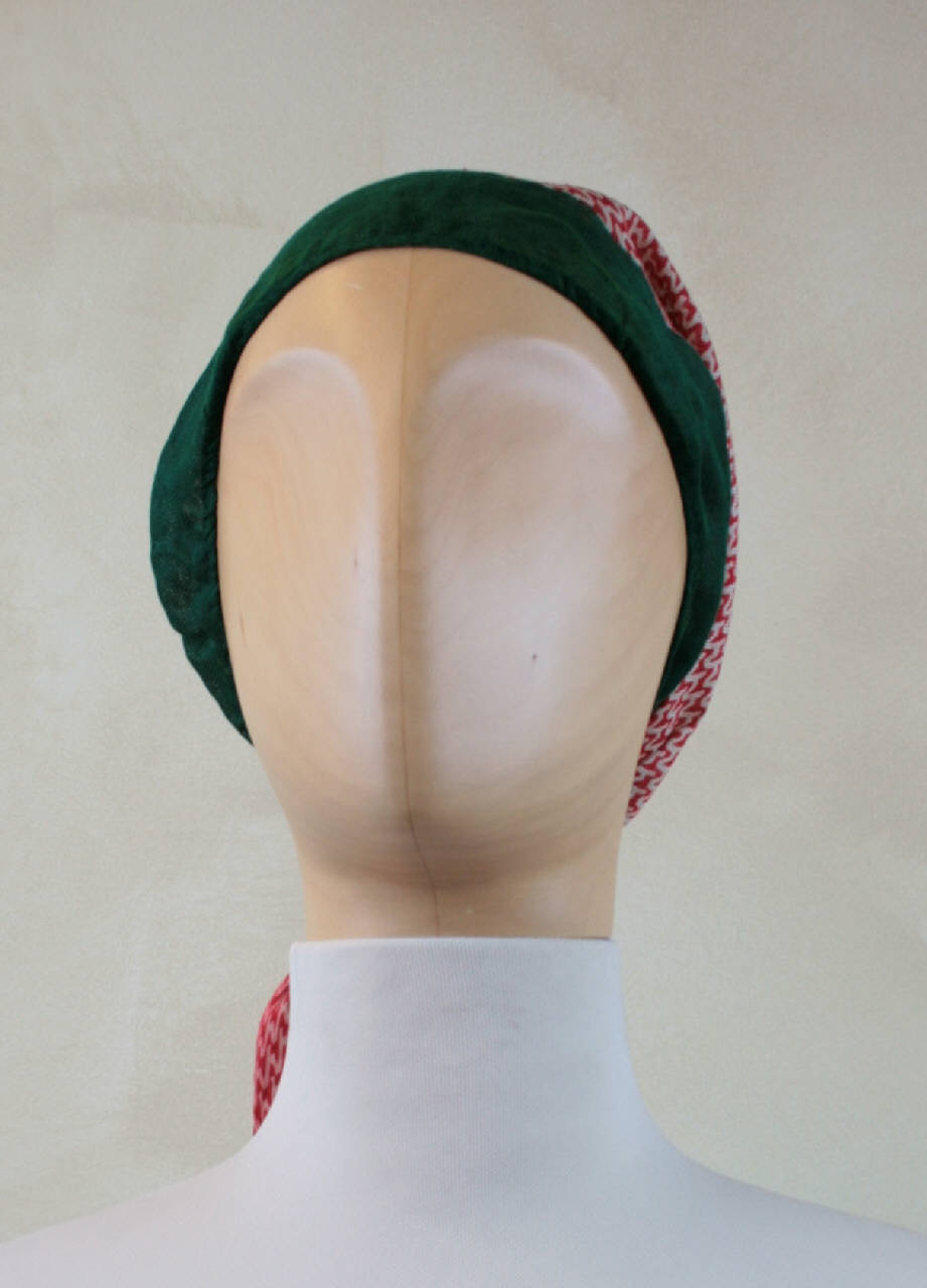 Cappello a forma di foulard annodato sulla nuca, in tela stampata a motivo di greche bianche su fondo rosso e ai bordi cornice verde scuro. Nella circonferenza è ristretto da elastico; sulla nuca coulisse con elastico, chiuso inoltre da laccetto elastico e gancetto. Al laccetto è annodato un foulard nello stesso tessuto che simula le cocche annodate. All'interno etichetta in nastro stampato. Sul retro dell'etichetta è cucita una fettuccia con il numero 44796.