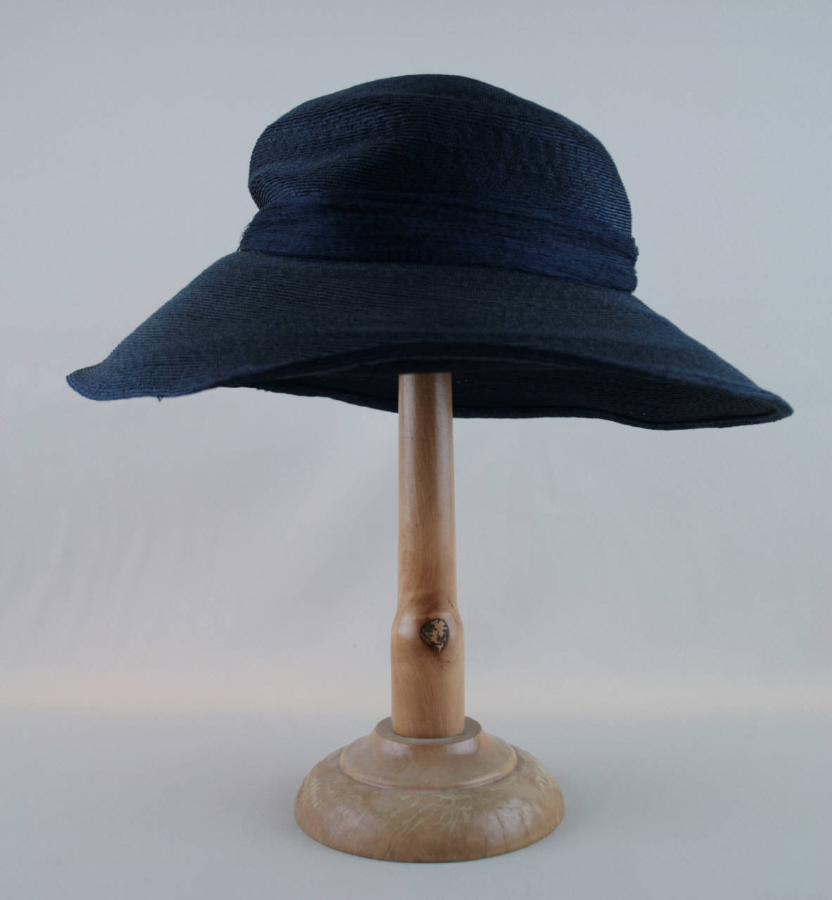 Cappello modello canotto di paglia blu, con tesa ampia. Calotta alta a cupola, decorata da cinta in veletta blu con nodo sul dietro. Tesa circolare legermente spiovente, con ferrino lungo il bordo. Giro d'entrata in nastro gros blu; elastico tubolare fissato all'interno per allacciatura. All'interno etichetta in nastro operato.