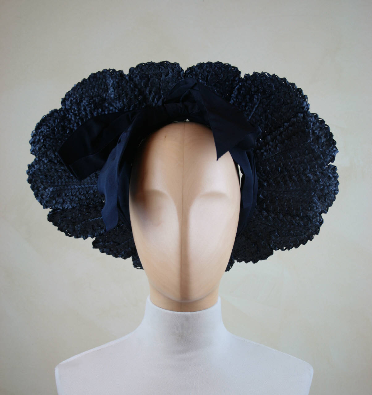 Visiera costituita da ampia tesa formata da petali di paglia blu. Di forma ovale, più ampia sui lati, sostenuta da alto nastro di gros blu con pieghe cucite che forma sul davanti un grande fiocco. All'interno etichetta in nastro stampato.
