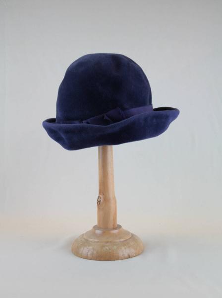 Cloche in feltro viola, con calotta alta a campana. Tesa ovale asimmetrica, cucita alla calotta e decorata da cinta in nastro gros viola con fiocco sul lato destro. Giro d'entrata in nastro gros viola. All'interno, nella cima timbro con stemma e nome del produttore del feltro; etichetta in nastro stampato del designer-commercializzatore.