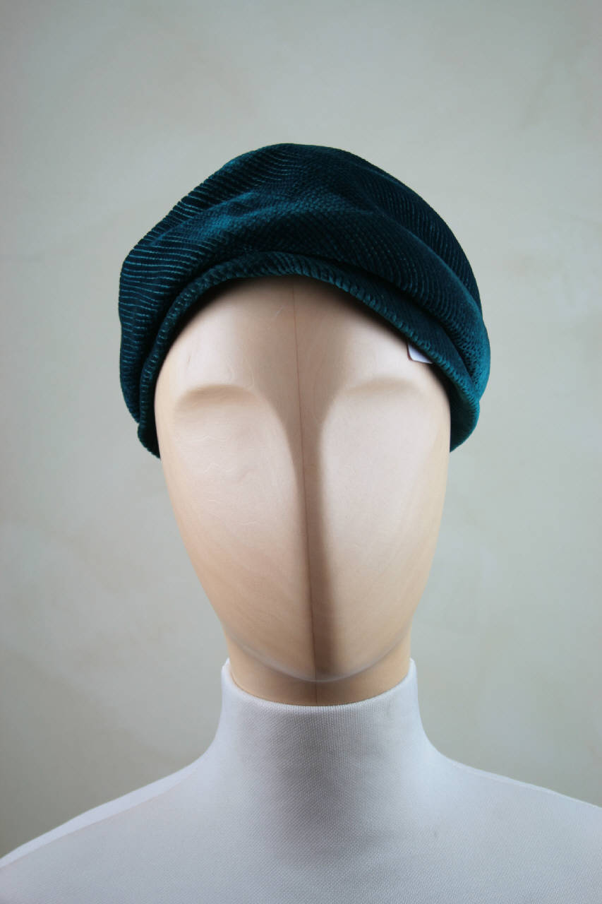 Toque in velluto tagliato verde petrolio, percorso da fitte impunture che definiscono sulla cima 8 spicchi. Calotta in due pezzi, con alta fascia asimmetrica con impunture in diagonale, più bassa sul dietro e con piccolo bordo rigido. Fodera in taffetas nero; giro d'entrata in nastro gros nero.