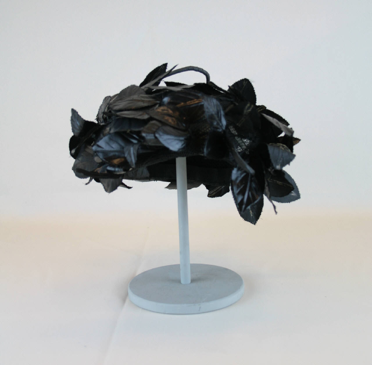 Toque in tulle rigido a maglie larghe, ricoperto da foglie in tessuto nero spalmato con anima in filo metallico e grande rosa nera in tessuto sul lato destro. Giro d'entrata in nastro gros nero. All'interno etichetta in nastro operato.
