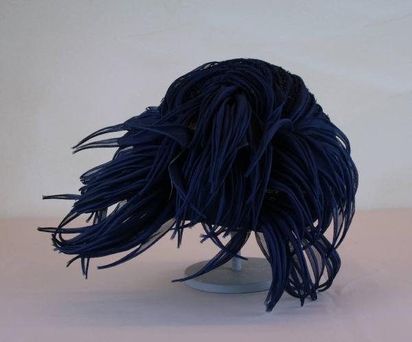 Toque ad effetto turbante, con pieghe che simulano passante, in tulle blu polvere, rigido a più strati. Coperto da fitti giri concentrici di tubolare in crespo dello stesso colore insertiti nella veletta blu che ricopre la calotta. Decorato sul davanti da grande ciuffo di petali in crespo, in parte tubolari in parte aperti, che sembrano fuoriuscire dal passante. Giro d'entrata in nastro gros blu. All'interno etichetta in nastro operato.