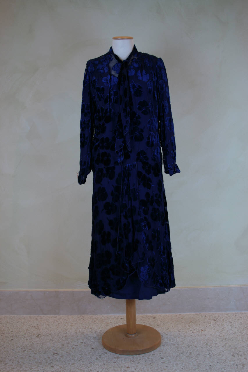 Abito a vita bassa, lungo al polpaccio, in velluto tagliato operato blu con fondo in crespo blu trasparente; motivo decorativo a corolle a quattro petali sparse. Corpino a vita bassa, con scollo a V chiuso da bottoncino e collo a cinturino da annodare. Arricciatura sulle spalle raccolta sui fianchi da gruppo di pinces. Maniche lunghe con breve spacco al fondo, chiuso da bottone rivestito e asola in filo. Gonna in un telo sbieco, con spacco anteriore chiuso a tratti da travette in filo e decorato con l'inserimento di due gheroni triangolari profilati in crespo viaola. Sottabito in raso blu, con maniche lunghe, profilato in crespo viola.