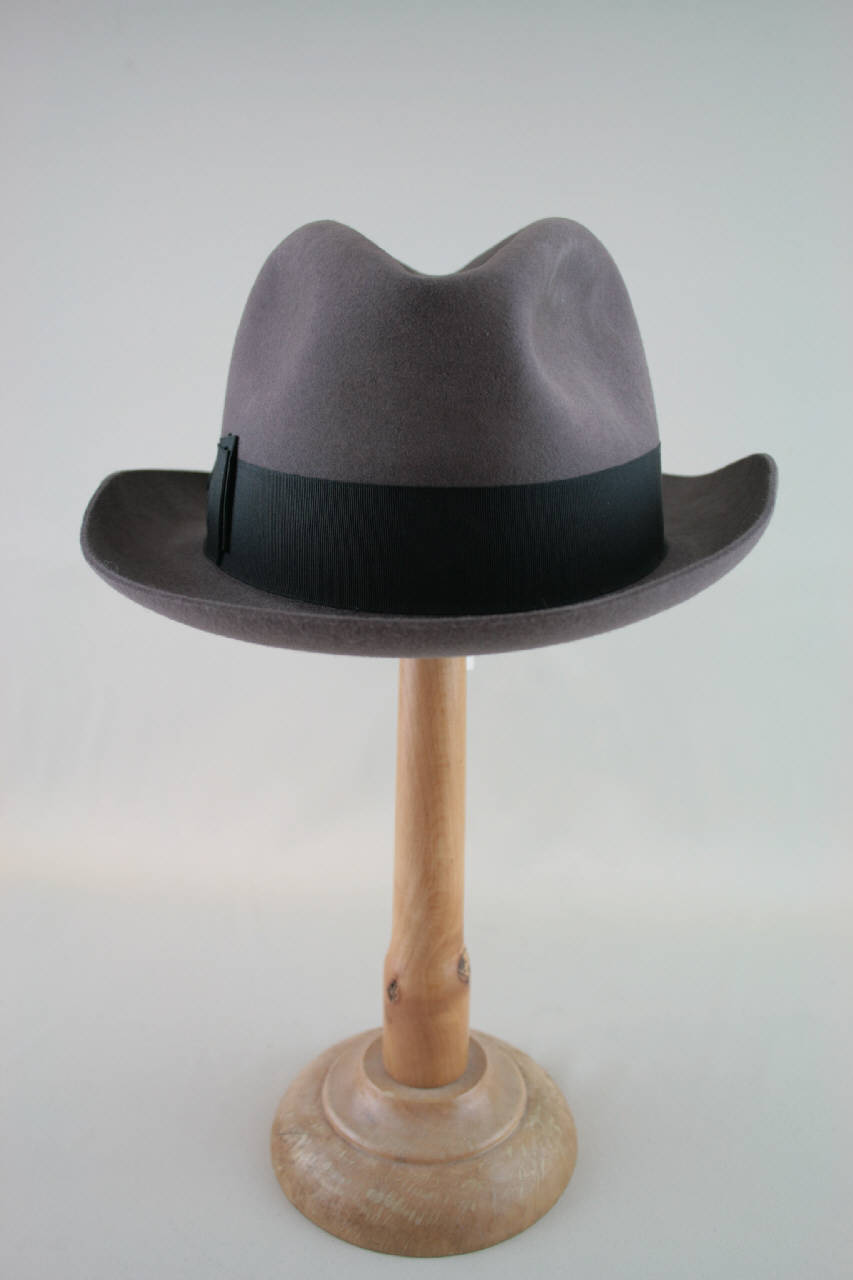 Cappello tipo trilby in feltro grigio tortora. Cinta in nastro gros in tono più scuro; tesa leggermente incurvata ai lati. Fodera in raso avorio, nella cima marchio in oro del produttore, protetto da inserto in organza cerata. Giro d'entrata in marocchino con timbro dorato del produttore, del rivenditore italiano e iniziali del proprietario M.Q.