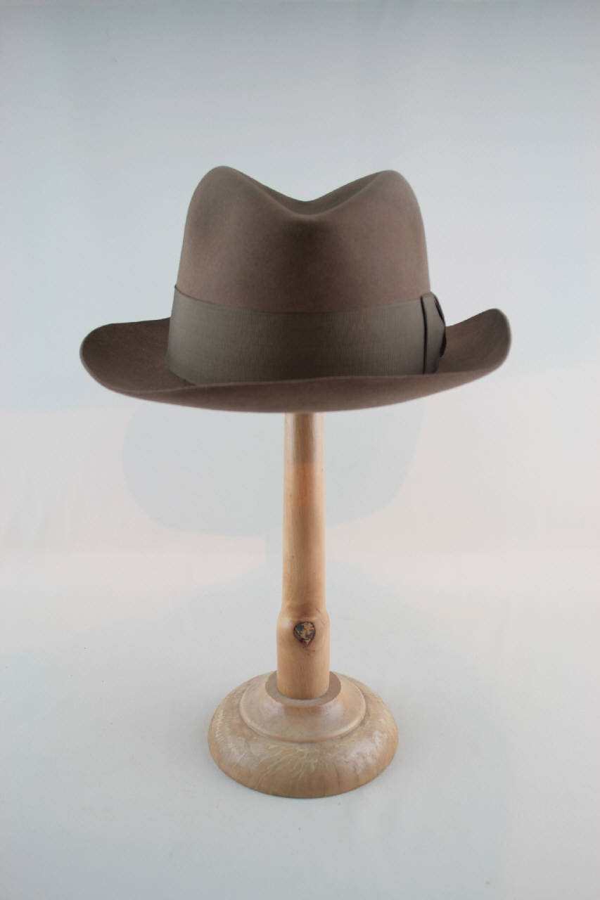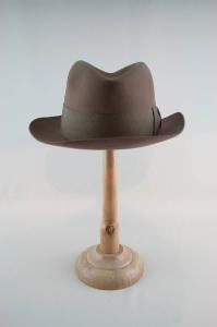 Cappello tipo trilby in feltro marrone chiaro rosato. Cinta in nastro gros in tono più scuro; tesa leggermente incurvata ai lati. Fodera in taffetas bianco, nella cima marchio in oro del produttore, protetto da inserto in organza cerata. Giro d'entrata in marocchino con timbro dorato del produttore, del rivenditore italiano e iniziali del proprietario M.Q.