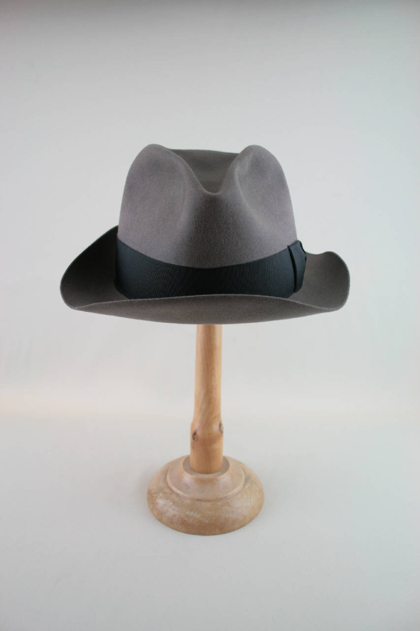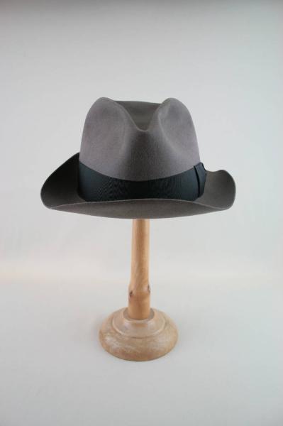 Cappello modello trilby in feltro color tortora. Cinta in nastro gros nero; tesa leggermente incurvata ai lati. Fodera in louisine avorio, nella cima marchio in oro del produttore, protetto da inserto in organza cerata. Giro d'entrata in marocchino con timbro dorato del rivenditore italiano e iniziali del proprietario M.Q.