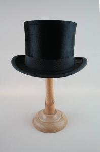 Cilindro in feltro nero, di castoro. Calotta cilindrica con leggero restringimento nella zona centrale; cima piatta. Stretta tesa con sottotesa in diagonale nero, lievemente rialzata ai lati. Cinta e profilo della tesa in nastro gros nero. Fodera in taffetas avorio; inserto della cima in pekin avorio con timbro dorato del produttore e iniziali del proprietario in carta dorata "MQ". Giro d'entrata in pelle bianca.