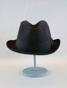 Cappello tipo trilby in feltro grigio scuro. Cinta in nastro gros nello stesso tono; tesa morbida. Fodera in raso avorio, nella cima inserto con marchio in oro del produttore e del rivenditore ricoperto da organza cerata. Giro d'entrata in marocchino con timbro dorato del produttore e del rivenditore italiano.