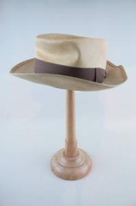 Cappello dalla forma poco leggibile perchè deformato, tipo trilby, in paglia naturale. Cinta in nastro gros marrone. All'interno, nella cima, è applicata una losanga in raso protetta da organza cerata con timbro del produttore. Giro d'entrata in cuoio con timbro nero.
