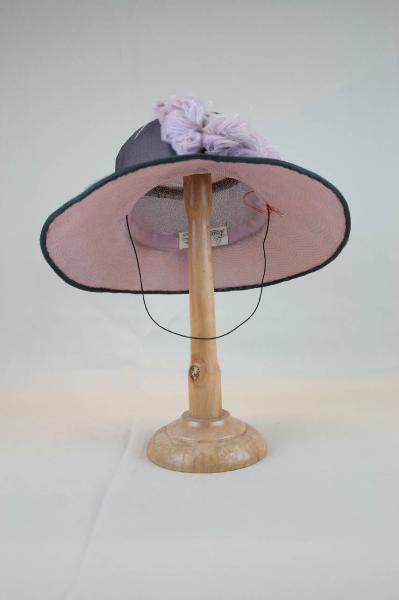 Cappello da cerimonia a tesa ampia in tulle rosa rigido a maglie larghe, ricoperto all'esterno da tulle rosa, nero e crespo nero. Calotta cilindrica, tesa circolare cucita alla calotta, decorata da impunture in filo rosa che descrivono smerli concentrici, velate dal crespo nero più esterno. Cinta in tulle nero con nodo e fiocchi di piume tinte in rosa applicati sul davanti. Giro d'entrata in nastro gros nero. All'interno etichetta in nastro operato.
