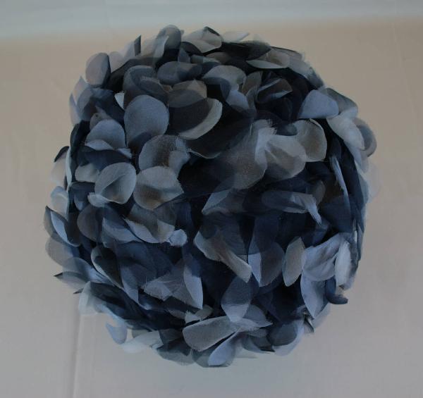 Toque con calotta bombata, in crespo blu. Ricoperto di fitti petali in crespo blu e celeste. Supporto interno in tulle rigido a maglie larghe e fodera in tulle blu. Giro d'entrata in gros blu.