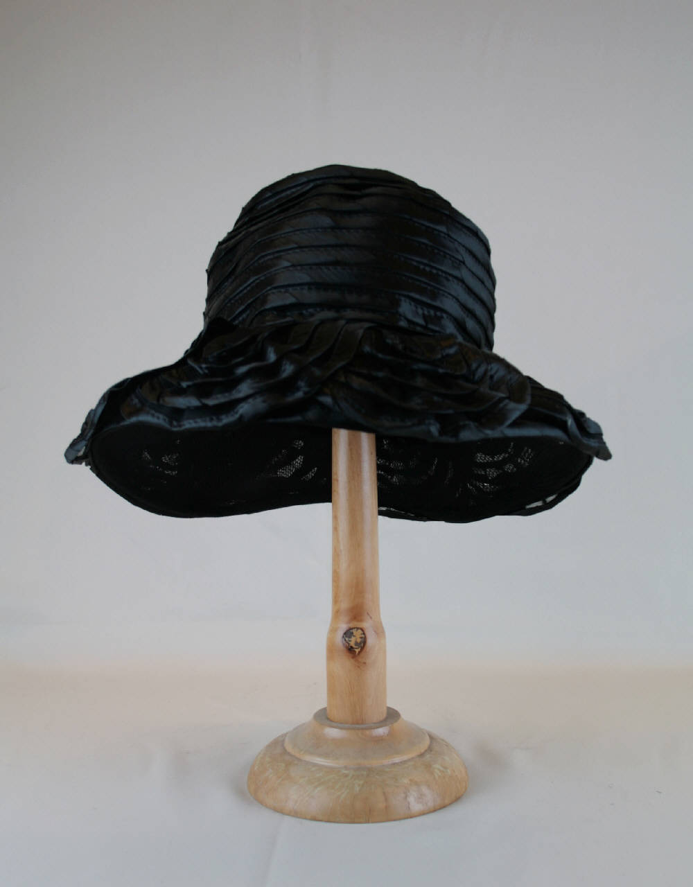 Cappello nero a tesa ampia, leggermente convessa. Treccia di nylon con largo profilo in nastro sbieco di raso nero, cucita su se stessa a spirale forma la cupola. La tesa è formata da petali a giri concentrici del nastro di raso. Supporto in tulle rigido a maglie larghe; sottotesa in tulle; giro d'entrata in nastro gros nero.