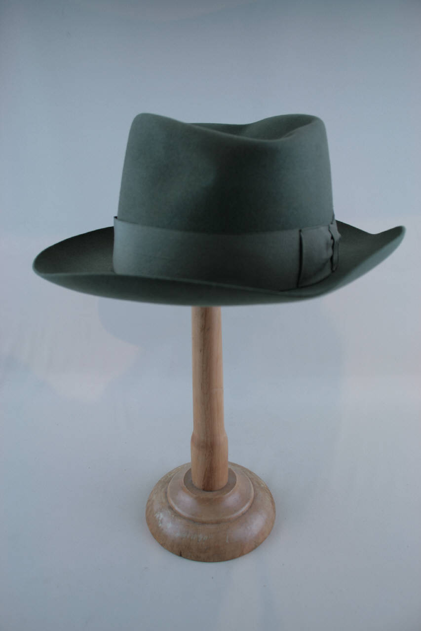 Cappello modello trilby in feltro verde salvia. Cinta in nastro gros di tono più scuro. Fodera in raso avorio, nella cima marchio del produttore, protetto da inserto in organza cerata color oro, profilata da cordoncino a tortiglione avorio. Giro d'entrata in pelle.